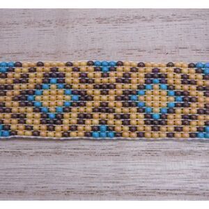 Bracelet is hand beaded using a loom. Made with wheat, brown and teal colored Czech glass beads.