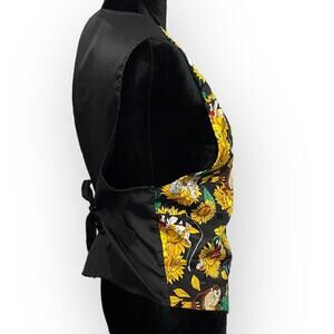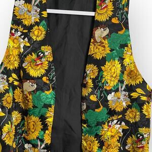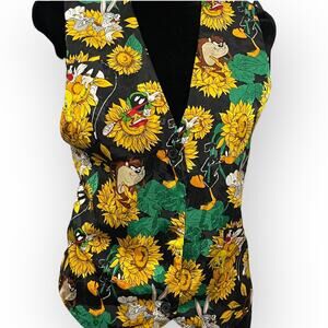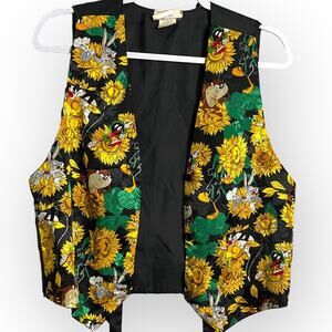 Beautiful vintage Looney Tunes Vest. This vest has a black base with sunflowers and characters printed on the front. It is solid black on the back. This vest does not have any pockets and has a three-button closure. Great condition! The perfect piece to add to your collection/wardrobe.