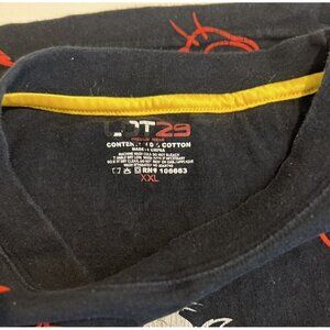 This Lot 29 Looney Tunes T-Shirt features an all-over graphic print of Angry Sylvester and Bugs Bunny. The vintage shirt is made of cotton and has a crew neck, short sleeves, and a regular fit. The black shirt also has glitter and a logo accent, making it a limited edition collectible.