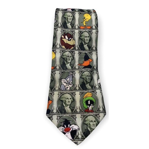 The George Washington Money Tie Looney Tweety Bird Taz Daffy Sylvester Necktie• Features Bugs Bunny, Tweety, Sylvester & more