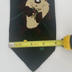 Show off your holiday spirit with this Looney Tunes Mania Tie featuring the Tazmanian Devil and Daffy Duck being silly. It looks like Taz is electrocuting Daffy. With Christmas Lights. The black tie is made of 100% polyester with a classic width and design throughout. This item is from 1995 and is perfect for any Looney Tunes or Christmas fan.