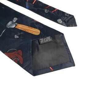 Fun Looney Tunes tie featuring Taz with power tools and accessories against a black background. Made of polyester, this tie is dry clean only.
