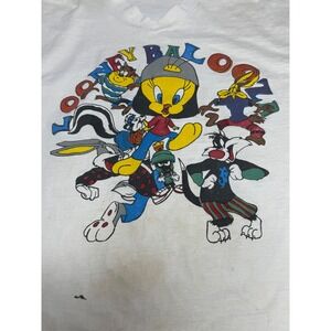 Relive your childhood with this vintage Looney Tunes t-shirt! This tee features a vibrant graphic of your favorite characters, including Tweety Bird, Bugs Bunny, Sylvester the Cat, and more, all ready for some Looney Ball fun. The classic v-neck design adds a touch of retro style to this comfortable white tee. While showing its age with some staining, this shirt is a true piece of nostalgia. Perfect for casual wear, a retro-themed party, or simply showing off your love for classic cartoons.