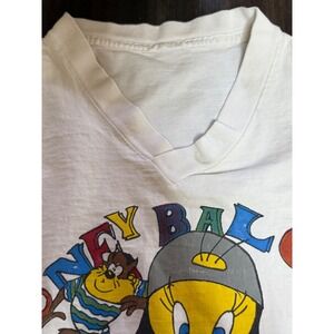 Keywords: Looney Tunes, Vintage T-Shirt, Cartoon Graphic Tee, White T-Shirt, V-Neck T-Shirt, Retro Shirt, 90s Cartoon, Bugs Bunny, Tweety Bird, Sylvester, Looney Ball, Warner Bros, Collectible Tee, Distressed Tee