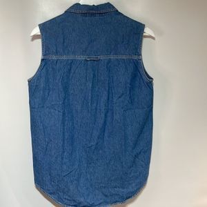 Looney Tunes Vintage Sleeveless Denim Top 90’s Tweety Bird Medium EUC medium blue color button front denim with embroidered tweety bits on one pocket and flowers on the other. Has been worn and washed in excellent condition: