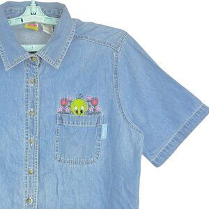 Looney Tunes Women Embroidery Tweety Bird Button Short Sleeve Blue Shirt 14W/16W
