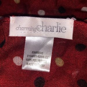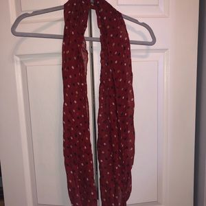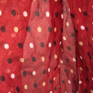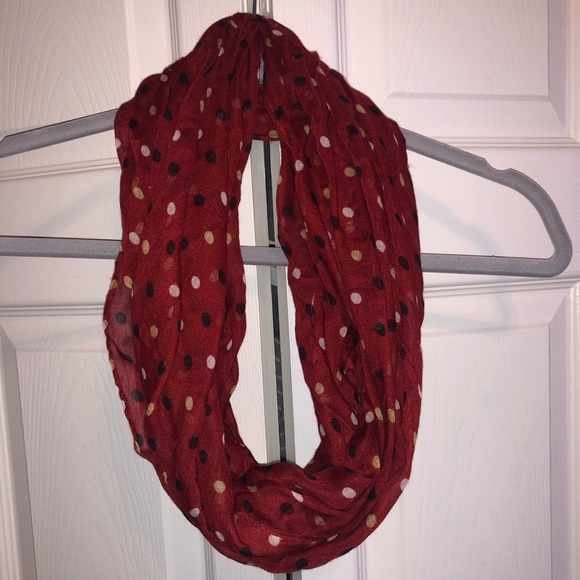 Thin fashion loop scarf. Red with black, yellow/gold, and white polka dots.