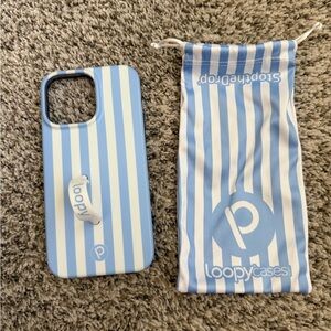 Stylish blue and white striped phone case. Includes matching pouch. Durable and easy to grip.