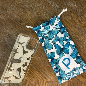 Eye-catching phone case with vibrant blue butterfly pattern and signature loop for holding. Includes a matching pouch. Great condition!