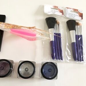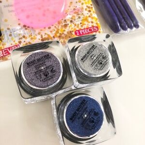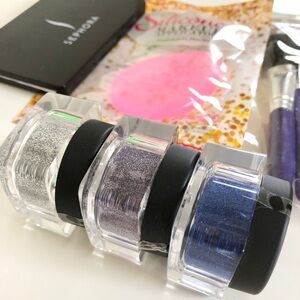 Pre-owned Loose Body Glitter & Makeup Brushes Bundle. This bundle includes 3 glitter jars, 1 silicone applicator, 8 brushes and 1 Sephora compact mirror. Glitter jars are 0.3oz each in 3 colors (Silver, midnight blue and periwinkle purple). Cosmetic brush packs are missing 1 brush, but all brushes are brand new, never used. Silicone applicator is new, never used, only one available (package is open). Sephora mirror has normal wear and scratches as seen in photos. Glitter is brand new.