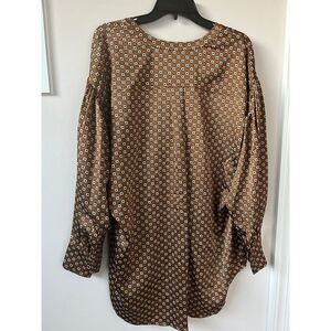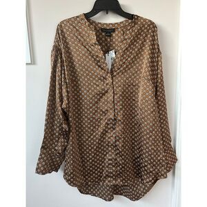 Brand new, with tags, never been worn brown blouse with intricate white and black polka dot pattern. Loose fitted, business casual chic, elevated style, classic look.