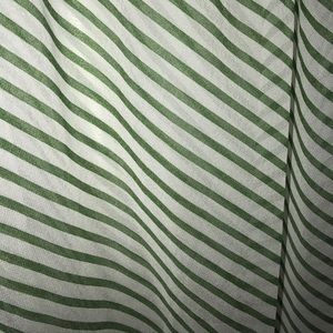 Green and white striped with a flower on the shoulder. Loose-fitting, beautiful detailing on the bottom. Great for summer
