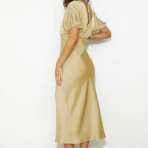 Step into effortless elegance with this Lopath Satin Midi Dress in a stunning yellow shade — perfect for fall weddings, date nights, or parties. Crafted from smooth, silky satin with a deep V neckline, puffy sleeves, and a tied open back, this dress exudes feminine charm and luxury. The empire waist and flowy midi silhouette flatter every curve, giving you that timeless, romantic look.