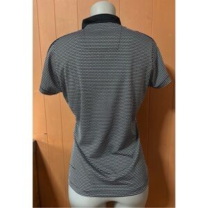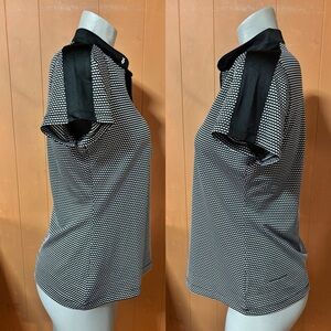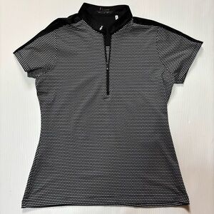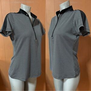 Nancy Lopez Golf Quarter Zip Top in Black & White, size M. Small black & white pattern with sold black accents at shoulders and collar. Deluxe Dri Fabric, stretchy comfortable 92 poly, 8% spandex for a fit that moves with you. Machine wash cold. Short sleeves. Small logo symbol on collar. Style L-426201. Pit to pit 19", pit to hem at side seam 16". Top of collar to hem at center back 25.25. In good condition except small area at lower left of back, near hem, where pattern narrows slightly from a pull. Shown in last photo. Not very noticeable, but I wanted to disclose. Priced accordingly. Ships promptly from non-smoking home. (#8127)