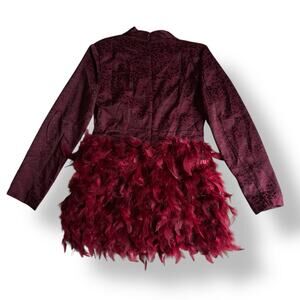 Absolutely jaw-dropping Loragal feather skirt mini dress in rich burgundy wine. Size Small. Luxe lace-textured bodice, long sleeves, fitted shape, and soft feather detail that adds major drama. Y2K glam, influencer-worthy. For going out, birthdays, NYE, or content shoots.