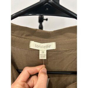 • Tags: Loralette shirt, peplum top, button-down blouse, embroidered trim, cotton blend shirt, womens 2X shirt, plus size blouse, casual top, fashion shirt, comfortable blouse, unique trim, brown peplum, chest pockets, shoulder buttons