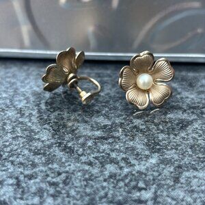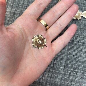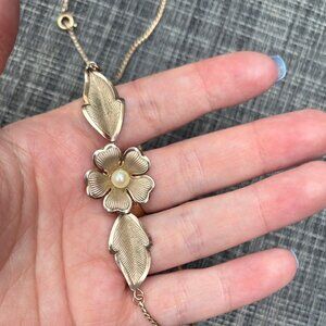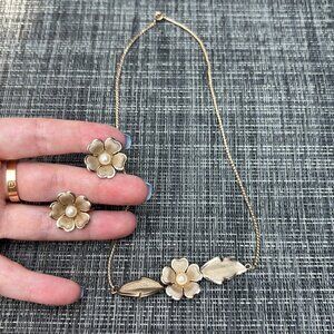 This elegant rose gold tone necklace with matching earrings features a charming flower design with a pearl center accent, perfect for adding a touch of sophistication to any outfit. Very good preowned condition.