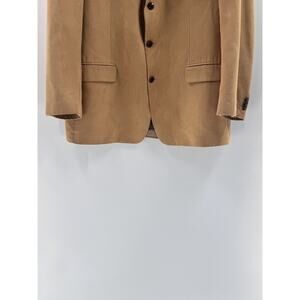 Elevate your wardrobe with this stylish Lord & Taylor Fifth Avenue Collection blazer jacket. Crafted from high-quality polyester microfiber fabric, this mid-length jacket features a solid beige color, spread collar, and button closure. The blazer is perfect for any occasion, whether it's a formal business meeting, a casual outing, or a party. The jacket has a regular fit and is available in size 44. It is easy to care for and should be dry cleaned only. The blazer also features pockets, a collar, and a lining made of polyester. This classic and timeless piece is a must-have for any fashion-conscious man. Subtle marks from use. Look carefully at close up pictures.