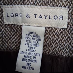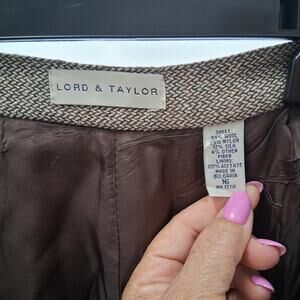Elevate your wardrobe with this sophisticated Lord & Taylor pant suit. Crafted from a luxurious blend of tweed wool and silk, this suit exudes timeless elegance. The set includes a jacket and matching pants, both in a flattering tan color.