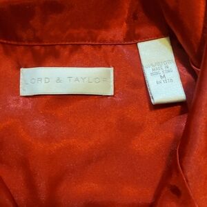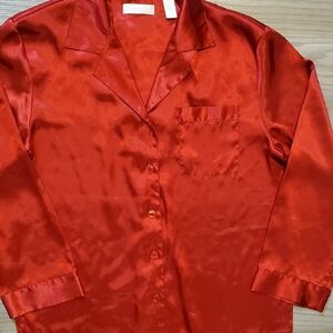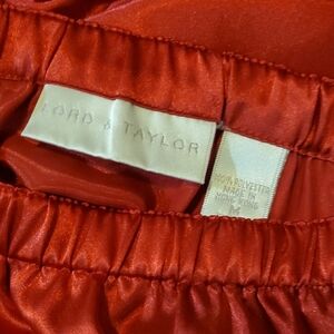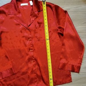 Indulge in luxurious comfort with this red satin pajamas from Lord & Taylor. Its lustrous finish and smooth texture offer a touch of elegance to your sleepwear collection. Perfect for a cozy night's rest or lounging in style. Please see photos for measurements. Fabric does not street but the waist of the pants have elastic. Pants also have a side slit at the bottom hem(see last 2 photos)