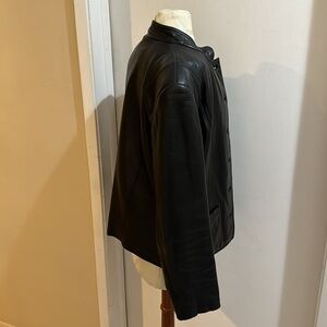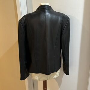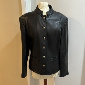 Vintage Lord & Taylor Genuine Leather in Black, Super Soft with a Mandarin Collar, Shoulder Pads, Lined, Goldtone Buttons~Button Up and 2 Pockets.