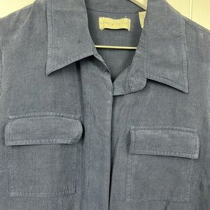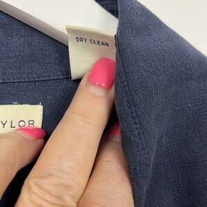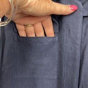 Lord & Taylor Vintage Womens Midi Shift Dress 14 Navy Blue Hidden Button Down Sleeveless Front Flap Pockets 72% Silk 28% Linen Classic Quality Chic EUC