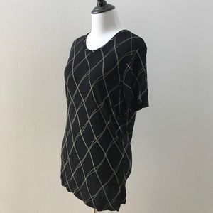 Black top with skinny gold diamonds all over. 100% rayon, made in Korean. Soft, slinky material with some stretch.