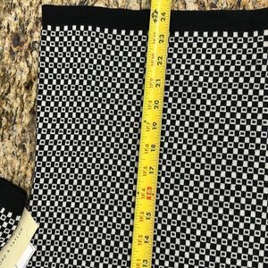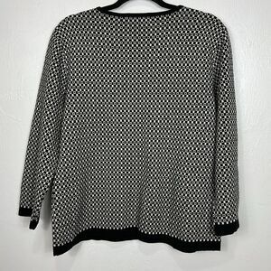 This is a stylish black and white patterned sweater with a geometric design. The sweater has a round neckline with a solid black trim, creating a clean and polished look. The cuffs and hemline also feature matching black trim for a cohesive finish. It has long sleeves and made of a soft, lightweight knit fabric, making it a great layering piece for cooler weather. This sweater is versatile and can be dressed up for work or paired with casual outfits for a chic everyday look