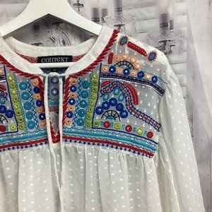Context by Lord & Taylor. White swiss dot blouse with a peasant style cut, drawstring neckline, embroidered on the shoulder part. Sheer with balloon sleeves 3/4 length. Very boho look. Brand new. No undershirt, this is a sheer top so you'll have to find something to wear under yourself.