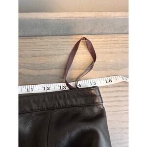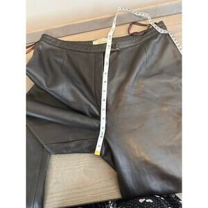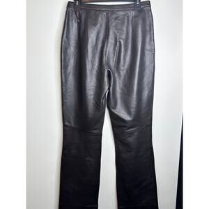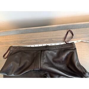 these are likely vintage, high-rise, and made of 100% leather, with a straight leg or bootcut style. They feature a zipper and button closure at the front. pre owned great condition no odor holes tears