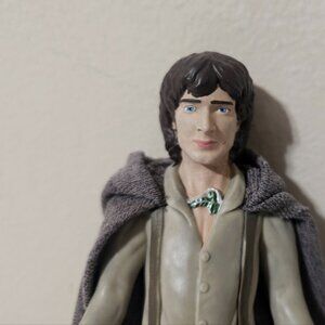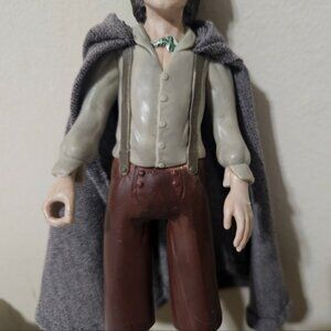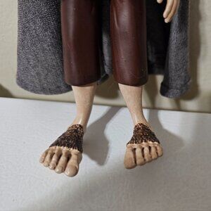 Action figure with a gray cloak and brown pants. Features detailed design.