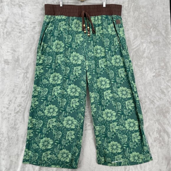 Lord of the Rings wide leg pull on pants in green floral/ leaf print with beaded bow detail at front waistband. Split leg. Material is lightweight, flowy rayon. Size 3X. Please see photos for measurements.