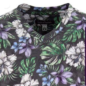Introducing Lords of Harlech - Maze Colorful Floral Black shirt. This captivating black shirt features vibrant purple and green flowers, short sleeves.
