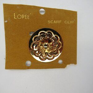 This elegant Loree' scarf clip features a gold-tone floral design, perfect for adding a touch of sophistication to scarves or garments. New on stock card - missing brooch converter.