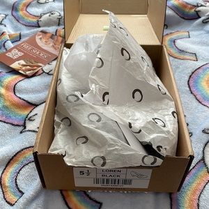 Runs half a size large. Never worn, just tried on. The elastic strap hangs loose on narrower feet