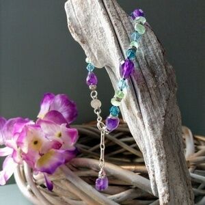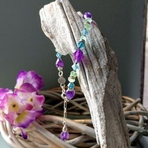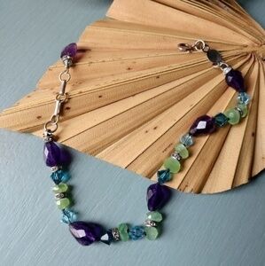 Beautiful, twinkling crystals in purples, greens and turquoise. About 8".