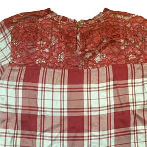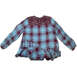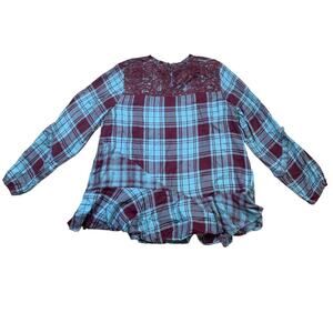 Lori Goldstein Blouse LOGO Lavish Plaid Teal Maroon Lace Ruffle Size Medium