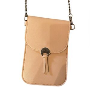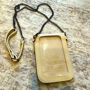 New without tags Classy and light-weight, featuring (3) credit card slots and a stylish chain shoulder strap w/adjustable vegan leather portion designed for maximum comfort! *Stadium Approved Sizing* Stylish and functional tan crossbody phone bag with a clear front for easy access. Perfect for keeping your phone secure and within reach.