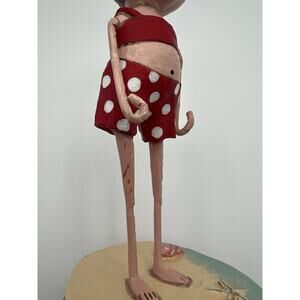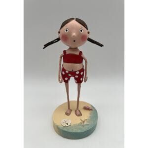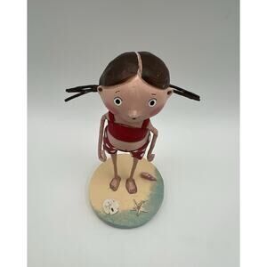Lori Mitchell figurine “Shelly Sells Seashells” girl at the beach. She is missing the bucket in her hand, she has a some light scuffing on her nose, orange paint on her leg and blue paint on the base (see photos). Measures approximately 6” tall.