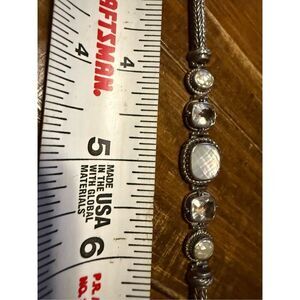 Stunning artisan-crafted bracelet by Lori Bonn, known for her detailed sterling silver work and vibrant gemstone designs. This piece features clear faceted gemstones and a luminous mother-of-pearl centerpiece, all set in intricately beaded and braided sterling silver.