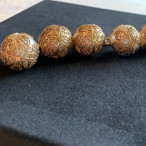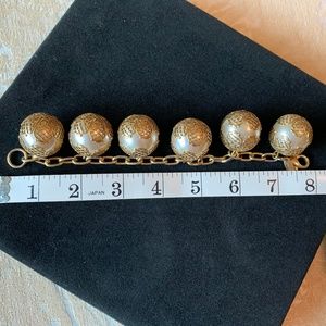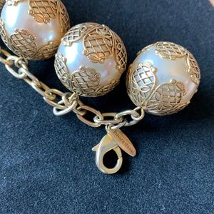 Pearl and gold tone filigree Lorna Dame designer bracelet. Fashion jewelry designer, Lorna Dame, has a playful ingenious approach that makes her jewelry internationally sought after. This gorgeous bracelet with faux pearls encased in beautiful gold-toned filigree is a wonderful example of her work. The vintage inspired bracelet is a lovely statement piece that takes any outfit to the next level. Bracelet has a lobster clasp and signature Lorna Dame branding tag.