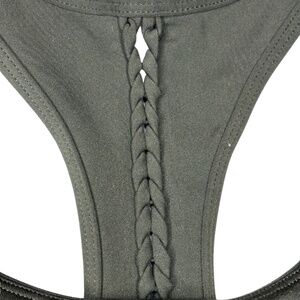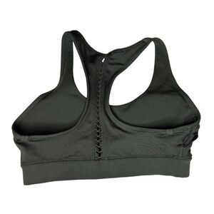 *Used* green Lorna Jane sports bra top & leggings activewear set in a size M. Features braided racerback detail & cutout slash design along each leg. Sports bra has removable padded cups. Also includes embedded red heart beads on each item.