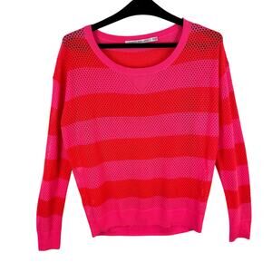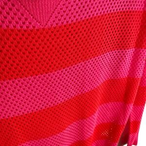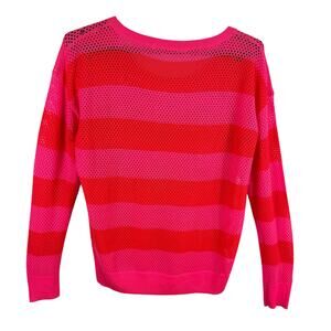 Excellent preowned condition. Red & pink striped long sleeve round neck open knit breathable pullover lightweight sweater. Acrylic material. Approx. measurements: Shoulder to hem 26", pit to pit 25", sleeve from neck to sleeve hem 31". Size M.