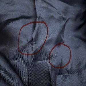 Good condition. No stains. Several small pinholes in the lining, as shown in photos.