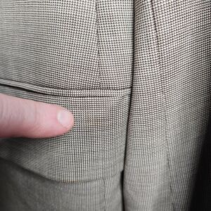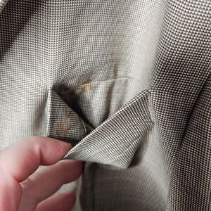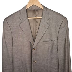 Unknown Brand Blazer made with Loro Piana wool fabric. Men's 54R. Brown. Lined. 3 Button closure. Shoulder pads. Good pre-owned condition with a light stain on the exterior pocket flap (see photo 3) and a stain on the inside of the chest pocket (see photo 5).
