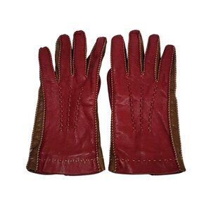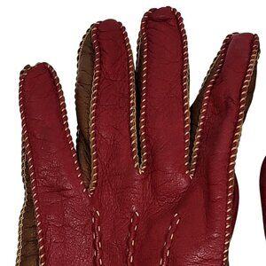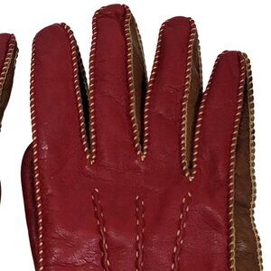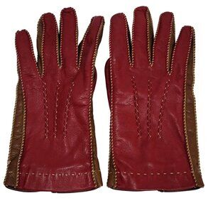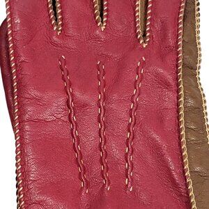 Women's Loro Piana red and brown leather gloves with contrast stitching, Cashmere and silk lined.