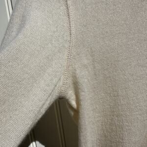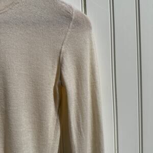 Gorgeous Loro Piana 100% cashmere sweater in a light cream color (best represented by the pics on the hanger taken in mid-day sunlight). Features a crew neckline with delicate ribbed knit banding, reinforced seams at the shoulders and a finished bottom hem and wrists, and a fitted cut. Italian size 40 (LP has a slim fit so US 2/4, measurements in pic). There is one tiny pull at the back of the left sleeve (see pics). I thought it was a pill but it is one pulled thread. One side of the tag fell off and a relative stitched it back on. Otherwise this is in perfect condition with no flaws or imperfections.