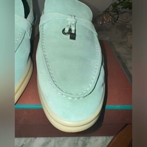 Size 39.5 Loro Piana suede loafers in light blue with silver charms, smoke free home. Some minor spots shown in photo. Excellent used condition. Includes the box and dust bags. Authentic