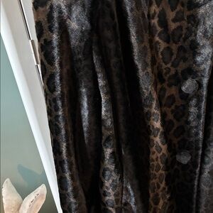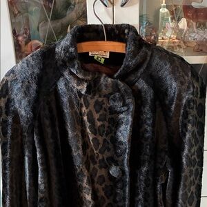 Stay stylish and warm with this chic leopard print faux fur coat. Perfect for adding a touch of elegance to any outfit. It looks like there is a pin used to hold the top button on, but I’m not 100% sure if that’s why it’s there. I don’t want to remove it in case it is because the button is set perfectly. This is a gorgeous coat. The lining appears to be an excellent condition. It has a dark black look to it with leopard print.