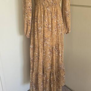 Lorraine Beige Chiffon w/ Mini Floral Prt. Gold Threads, Bohemian Dress, NWT, 12
